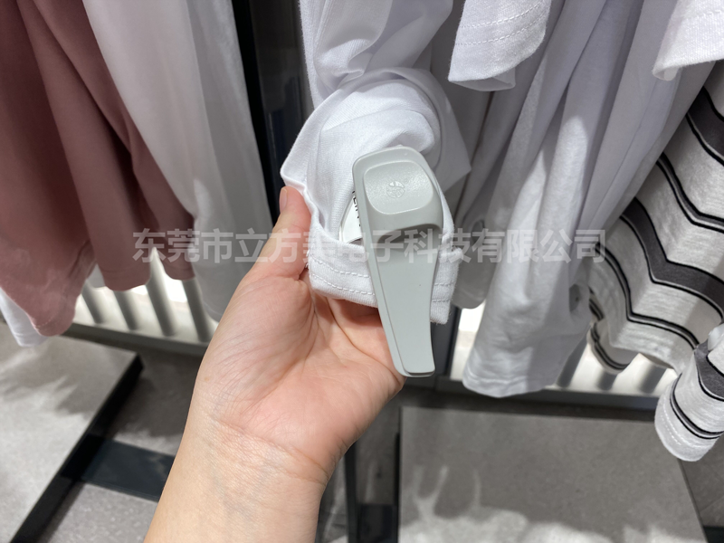 4. 超市里像衣服,包包,鞋子,帽子、家纺等产品,一般都是使用防盗扣,直接扣在商品上,取钉时配合解扣器使用,防盗扣可重复使用。